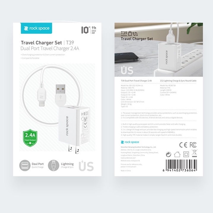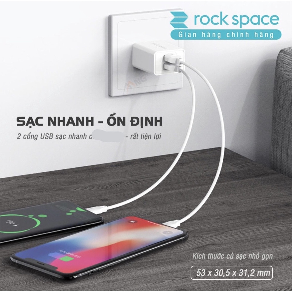 + Củ sạc iphone chính hãng Rockspace T39 2,4A; 2 cổng USB sạc nhanh iphone, không nóng, củ sạc iphone có 2 cổng tiện lợi có thể sạc hai thiết bị cùng lúc, tốc độ sạc nhanh