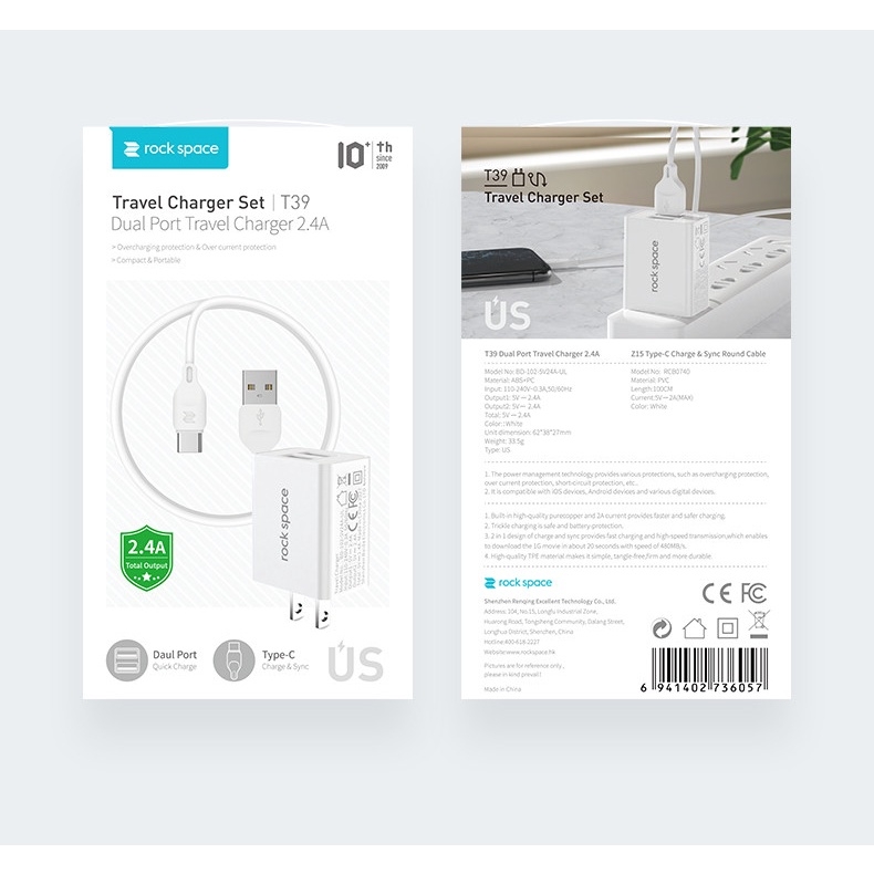 Củ sạc TypeC chính hãng Rockspace T39 2,4A; 2 cổng USB sạc nhanh cho android, không nóng, cốc sạc có 2 cổng tiện lợi có thể sạc hai thiết bị cùng lúc, tốc độ sạc nhanh