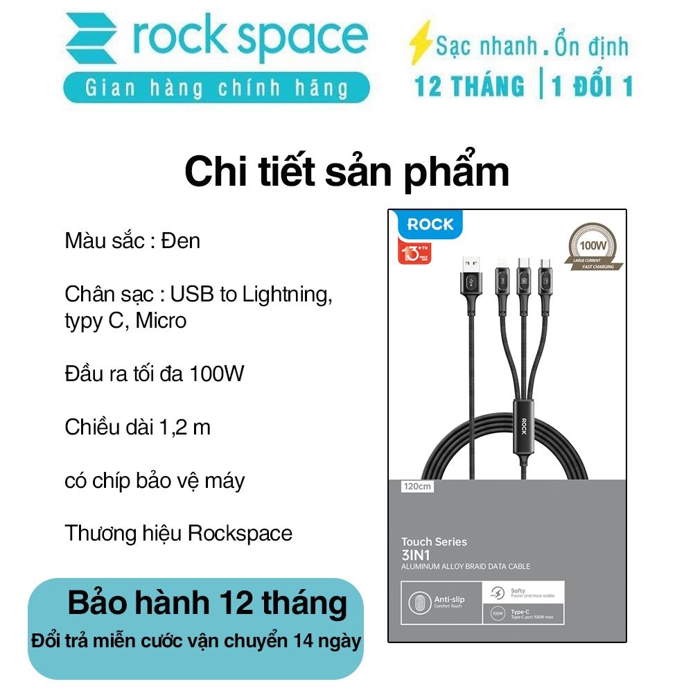 - Dây cáp sạc nhanh 3 đầu iphone typeC micro Rock Touch Series được bảo hành 1 đổi 1 suốt 12 tháng và miễn phí đổi mới 100% trong suốt thời gian bảo hành.
