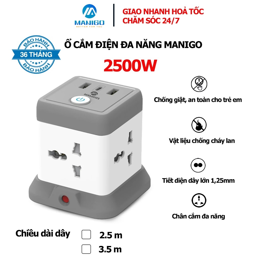 - Ổ Cắm điện thông minh kéo dài dạng tháp Manigo được bảo hành 36 tháng tính từ lúc nhận hàng