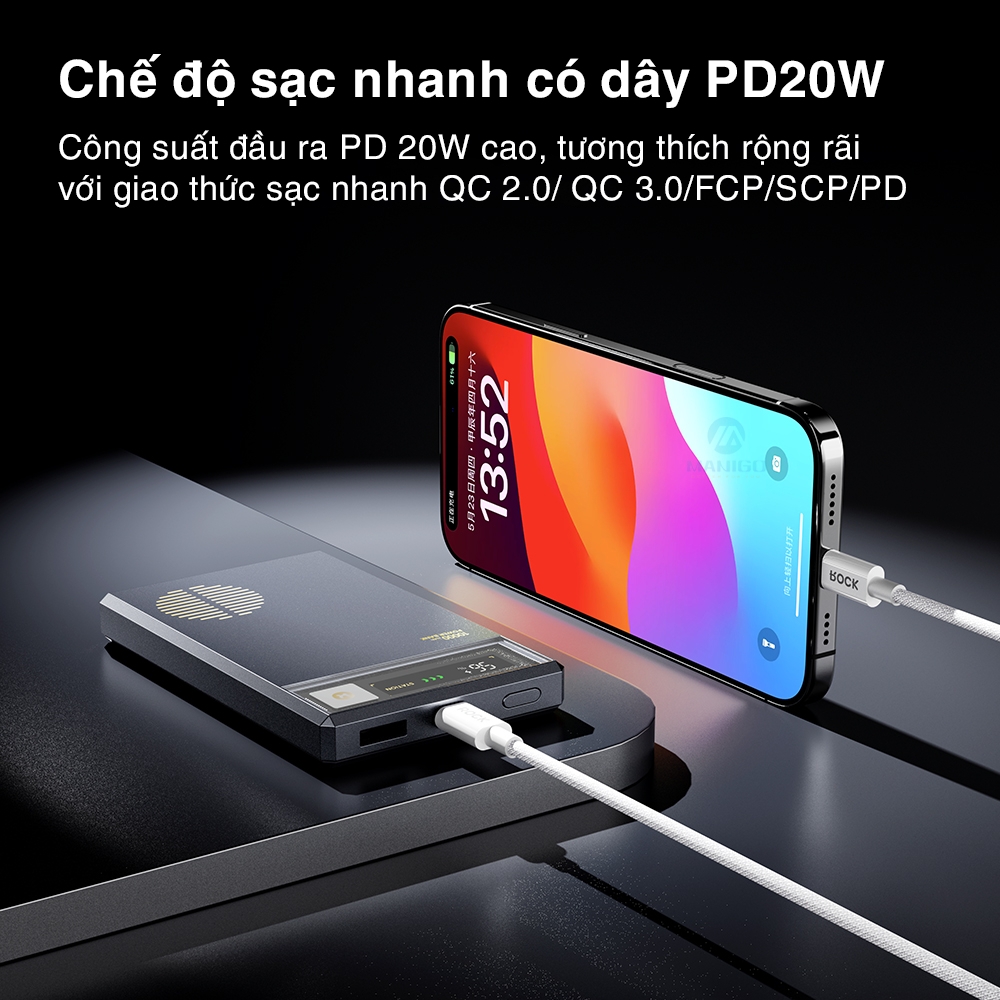 Pin sạc dự phòng không dây 10000mAh sạc nhanh PD 20W Rockspace Retro chính hãng hỗ trợ sạc nhanh PD 20W/QC2.0/QC3.0, sạc không bị nóng máy với 2 cổng sạc USB – TypeC có thể sạc được 2 thiết bị cùng 1 lúc. ---------------- TẠI SAO NÊN MUA HÀNG CỦA SHOP: - Shop mall, bên mình là nhà phân phối chính thức của hãng Rockspace - Pin sạc dự phòng không dây 10000mAh sạc nhanh PD 20W Rockspace Retro giống y hình và mô tả, nếu không giống shop sẽ hoàn 100 % tiền và chịu phí ship - Pin sạc dự phòng không dây 10000mAh sạc nhanh PD 20W Rockspace Retro được bảo hành 1 đổi 1 suốt 12 tháng và miễn phí đổi mới 100% trong suốt thời gian bảo hành. - Được hỗ trợ phí ship cả hai chiều nếu sản phẩm lỗi trong vòng 14 ngày kể từ ngày mua - Trước khi xuất hàng, sản phẩm được kiểm tra, sau đó đóng hộp cẩn thận giảm tối đa hàng lỗi nếu có.https://cf.shopee.vn/file/vn-11134208-7ra0g-m8cs734ytoj2a6 ƯU ĐIỂM SẢN PHẨM: - Pin sạc dự phòng không dây 10000mAh sạc nhanh PD 20W Rockspace Retro được làm bằng chất liệu nhựa ABS chống cháy + PC, thiết kế nhỏ gọn mỏng dễ dàng cho vào túi khi đi làm, đi công tác, đi du lịch,... - Pin sạc dự phòng không dây 10000mAh sạc nhanh PD 20W Rockspace Retro có đèn led báo hiệu % pin, giúp bạn có thể dễ dàng kiểm tra %pin còn lại của sạc dự phòng giúp bạn luôn chủ động sạc pin dự phòng để bạn luôn có 1 lượng pin đủ đầy. - Pin sạc dự phòng không dây 10000mAh sạc nhanh PD 20W Rockspace Retro có sạc đầu vào Type C giúp có thể sạc đầy pin sạc dự phòng một cách nhanh chóng. - Pin sạc dự phòng không dây 10000mAh sạc nhanh PD 20W Rockspace Retro hỗ trợ công nghệ magentic cho iPhone 8- 12,13, Mi11, Samsung S21, Mate40, dễ dàng dính chặt vào lưng điện thoại với nam châm hút siêu mạnh - Pin sạc dự phòng không dây 10000mAh sạc nhanh PD 20W Rockspace Retro có nam châm hút vào các dòng hỗ trợ sạc nhanh không dây magnetic, hấp thụ từ tính mạnh mẽ dành riêng cho iphone 12 series, phone 13 series,... - Pin sạc dự phòng không dây 10000mAh sạc nhanh PD 20W Rockspace Retro khả năng tương thích rộng, có thể sạc không dây các thiết bị nhỏ như tai nghe aripod, apple watch,... THÔNG SỐ KỸ THUẬT: 1 Chất liệu: ABS + PC chống cháy 2, Đầu vào: 5V=3A 9V=2A 3, Loại 4, Đầu ra USB: 5V=3A 9V=2A 12V=1.5A 10V=2.25A 5 、 Đầu ra sạc không dây: 5W/7.5W/10W/15W(Tối đa) 6, Tổng đầu ra: 5V=3A 7、Dung lượng pin: 10000mAh (38,5Wh) 8, Dung lượng định mức: 5200mAh(5V=3A) 9, Loại pin: Lithium Polymer 10, Tỷ lệ chuyển đổi năng lượng: ≥52% 11, Kích thước sản phẩm: Xấp xỉ. 108×68×16,5mm 12. Màu sắc: Xám đậm, Vàng sâm panh 13, Trọng lượng: 215g #sacduphongmagsafe #sacduphongkhongday #pinduphong #sacduphongmagsafe #pinsacduphong #cusacduphong #sacduphonexiaomi #pinduphong #sacduphoneanker #sacpiniphone #pinsac #pinaa #sacduphongkhongday #sacduphonemini #sacdienthoaiiphone #sacxiaomi #sacduphonenangluongmattroi #sacduphongenergizer #sacduphongxiaomigen3 #sacduphongremax #sacduphonebaceus #sacnhanhip13 #sackhongdayip13 #sackhongday #sacnhanhkhongday #pinduphongkhongday #pinduphongsacnhanh #pinduphongp88 #Pinduphongrockspacehttps://cf.shopee.vn/file/vn-11134208-7r98o-lr5r2w58pnrteahttps://cf.shopee.vn/file/vn-11134208-7ra0g-m8cs734yv33ic1https://cf.shopee.vn/file/vn-11134208-7ra0g-m8cs734ywhnye8https://cf.shopee.vn/file/vn-11134208-7ra0g-m8cs734yxw8ef3https://cf.shopee.vn/file/vn-11134208-7ras8-m1xya9v0e5oz0fhttps://cf.shopee.vn/file/vn-11134208-7ras8-m1xya9v0fk9f2chttps://cf.shopee.vn/file/vn-11134208-7ras8-m1xya9v0gytvd0