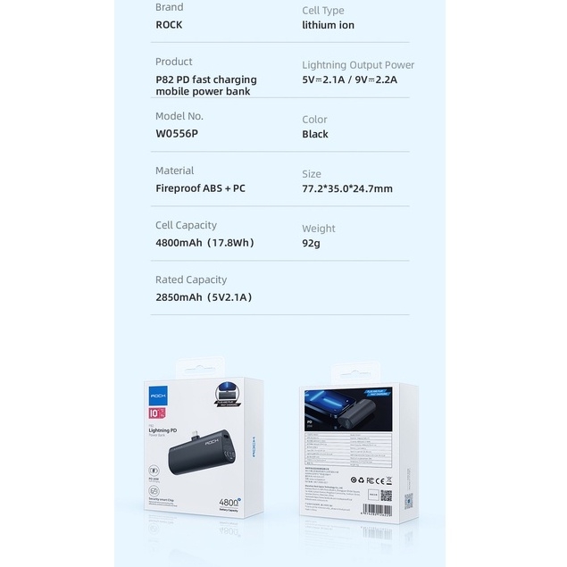 - Pin sạc dự phòng thích hợp chân cắm lightning Rockspace P82 có thể cắm trực tiếp để sạc, hỗ trợ sạc nhanh PD 20W cho các dòng iphone