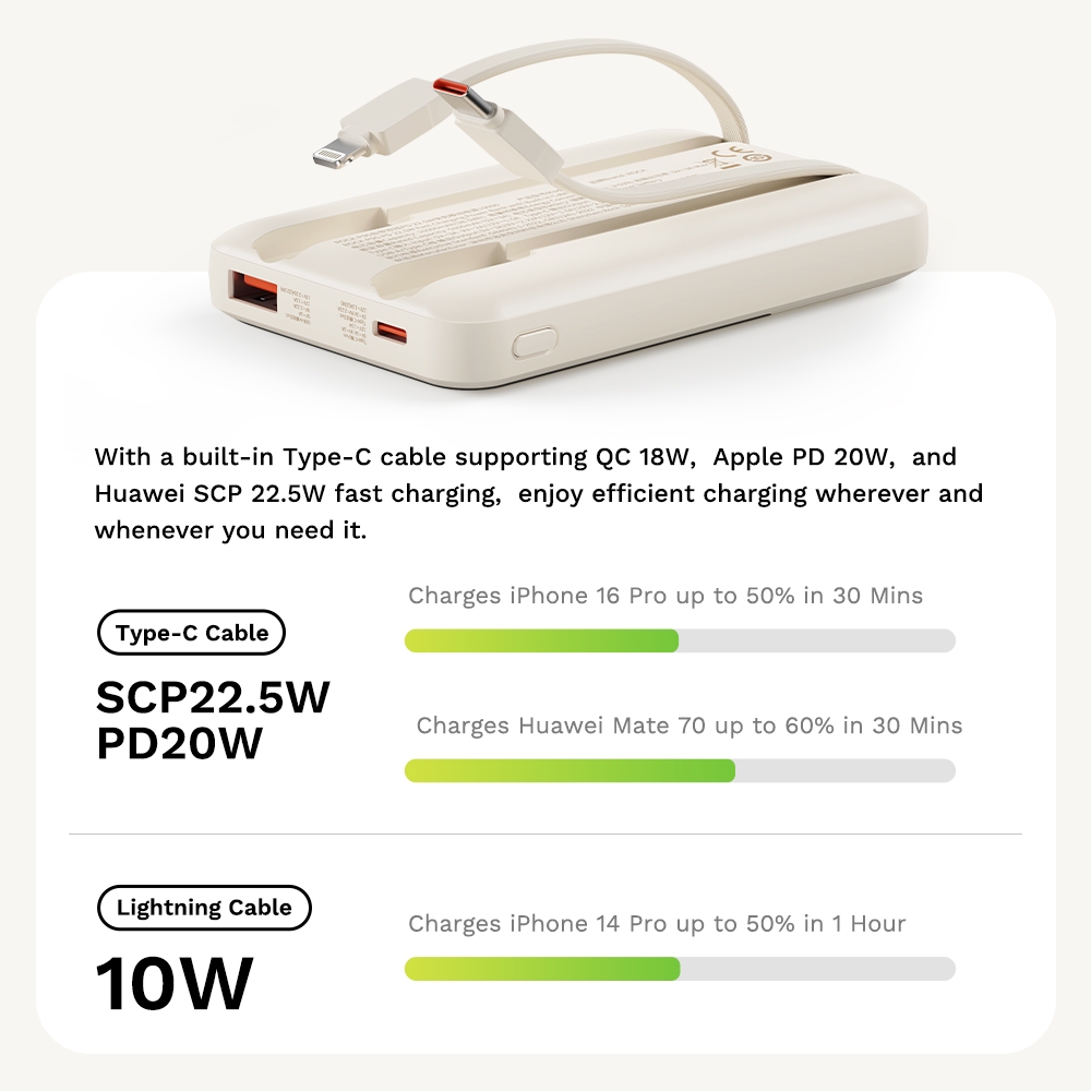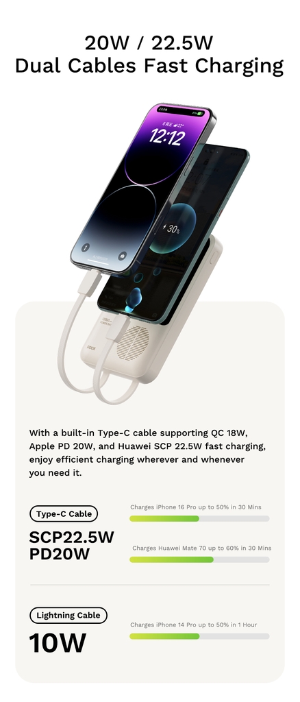 Tích hợp cáp sạc nhanh lightning+ typeC, sạc nhanh 22,5W