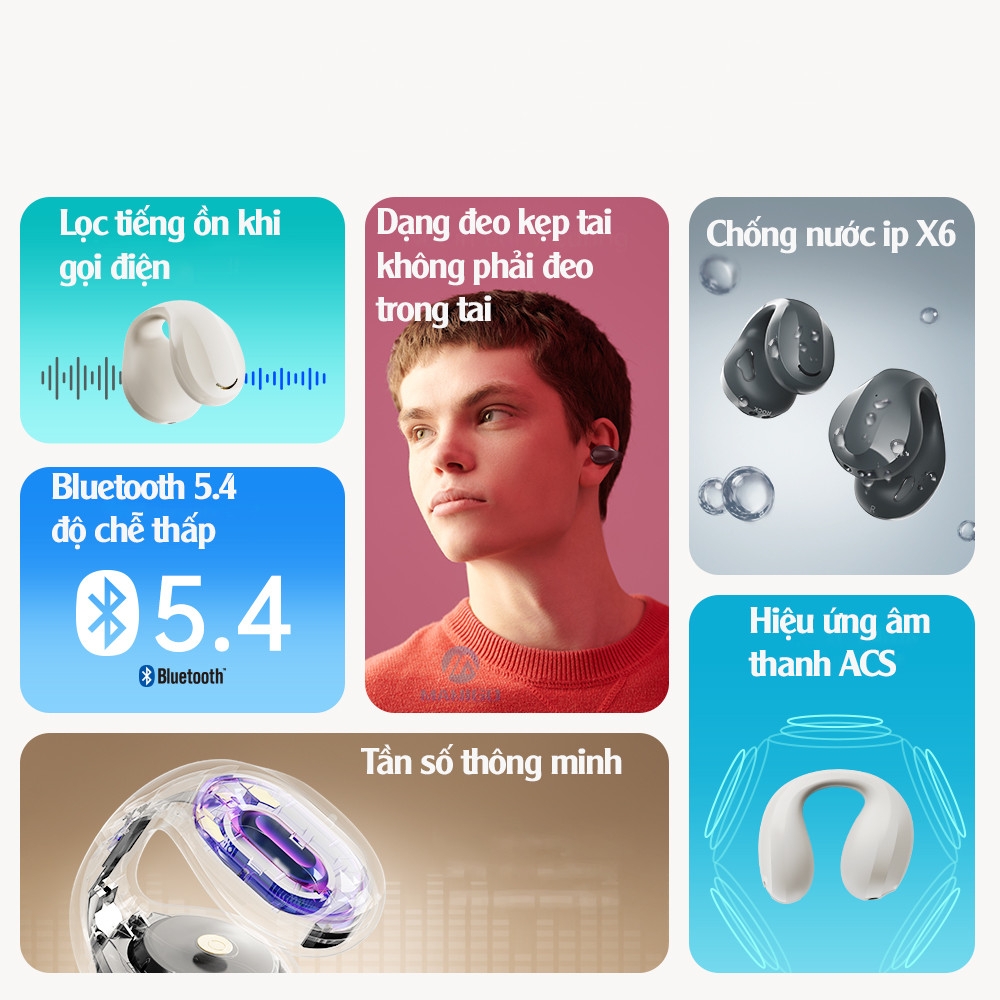 - Tai nghe bluetooth không dây kẹp vành tai TWS Rockspace Sound EarCuffs truyền âm qua xương âm thanh chất lượng cao bluetooth 5.4, độ trễ thấp mang lại cảm giác nghe nhạc ổn định, liên tục